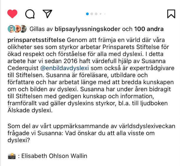 Prinsparets stiftelses inlägg om mitt dyslexiarbete