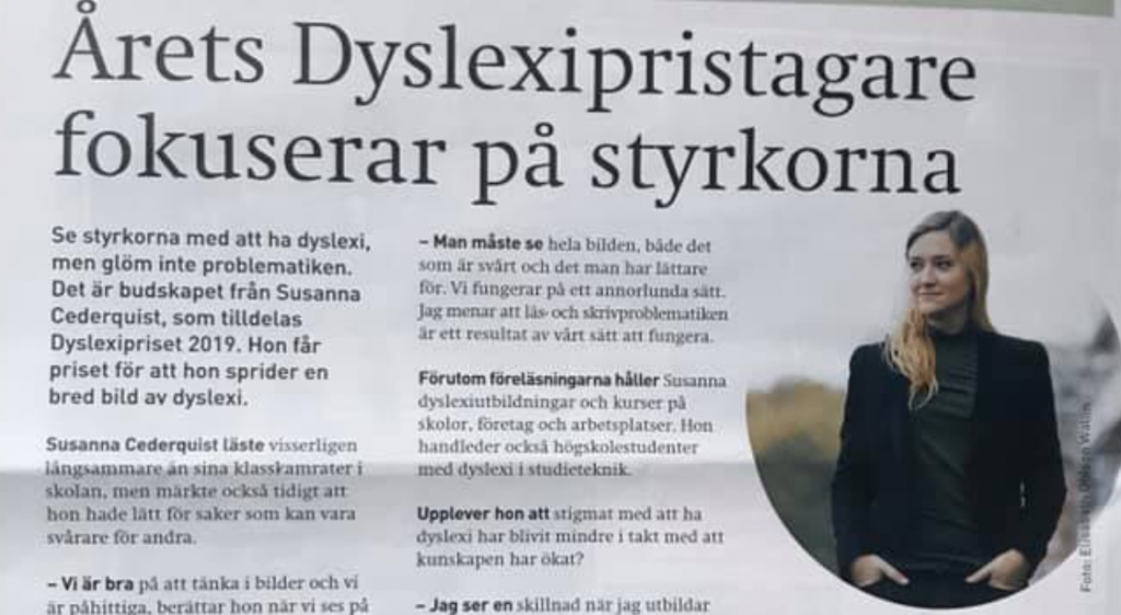 Susanna: ”Dyslexi en naturlig följd av ett annat sätt att tänka” Artikel om Susanna och hennes arbete i Lärarnas tidning 9 november 2019: