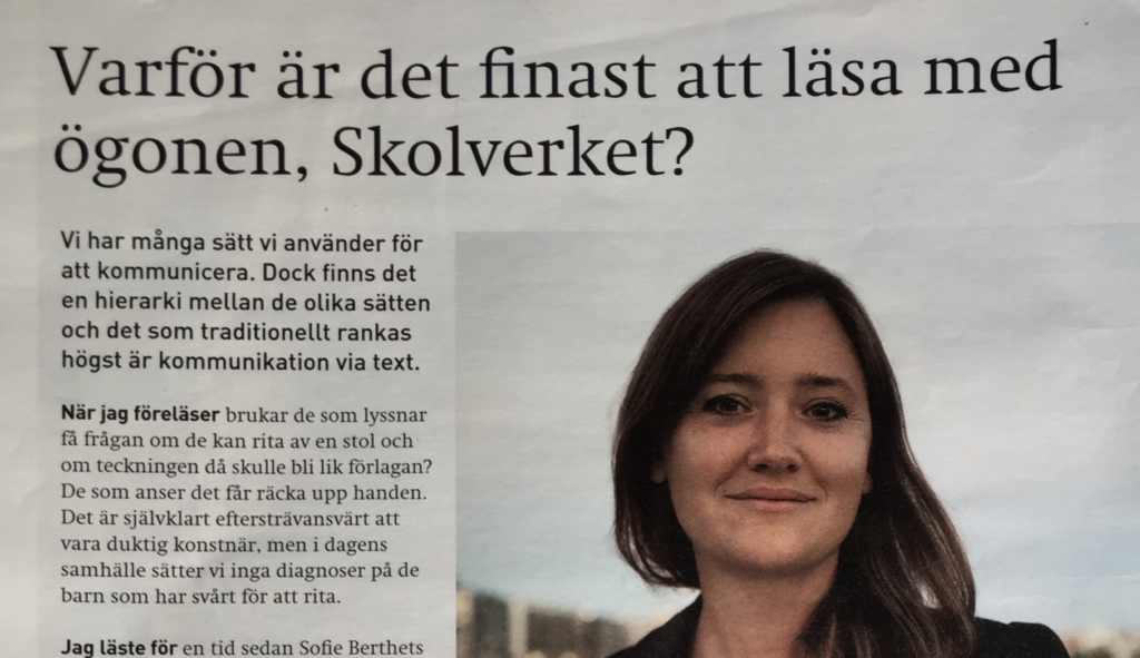 Tidningen ”Läs och Skriv” nummer 1, 2017, – Varför är det finast att läsa med ögonen, Skolverket? Insändare som belyser vikten av tillgänglig text och allas rätt till en likvärdig utbildning. Artikel i Dyslexiförbundets tidning ”Läs och Skriv” nummer 1, 2017, av Susanna Cederquist / En Bild av Dyslexi. Läs hela artikeln här